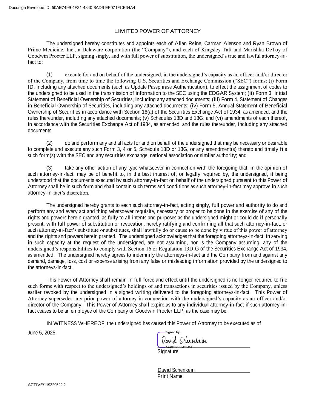 ACTIVE/119329522.2 LIMITED POWER OF ATTORNEY The undersigned hereby constitutes and appoints each of Allan Reine, Carman Alenson and Ryan Brown of Prime Medicine, Inc., a Delaware corporation (the “Company”), and each of Kingsley Taft and Marishka DeToy of Goodwin Procter LLP, signing singly, and with full power of substitution, the undersigned’s true and lawful attorney-in- fact to: (1) execute for and on behalf of the undersigned, in the undersigned’s capacity as an officer and/or director of the Company, from time to time the following U.S. Securities and Exchange Commission (“SEC”) forms: (i) Form ID, including any attached documents (such as Update Passphrase Authentication), to effect the assignment of codes to the undersigned to be used in the transmission of information to the SEC using the EDGAR System; (ii) Form 3, Initial Statement of Beneficial Ownership of Securities, including any attached documents; (iii) Form 4, Statement of Changes in Beneficial Ownership of Securities, including any attached documents; (iv) Form 5, Annual Statement of Beneficial Ownership of Securities in accordance with Section 16(a) of the Securities Exchange Act of 1934, as amended, and the rules thereunder, including any attached documents; (v) Schedules 13D and 13G; and (vi) amendments of each thereof, in accordance with the Securities Exchange Act of 1934, as amended, and the rules thereunder, including any attached documents; (2) do and perform any and all acts for and on behalf of the undersigned that may be necessary or desirable to complete and execute any such Form 3, 4 or 5, Schedule 13D or 13G, or any amendment(s) thereto and timely file such form(s) with the SEC and any securities exchange, national association or similar authority; and (3) take any other action of any type whatsoever in connection with the foregoing that, in the opinion of such attorney-in-fact, may be of benefit to, in the best interest of, or legally required by, the undersigned, it being understood that the documents executed by such attorney-in-fact on behalf of the undersigned pursuant to this Power of Attorney shall be in such form and shall contain such terms and conditions as such attorney-in-fact may approve in such attorney-in-fact’s discretion. The undersigned hereby grants to each such attorney-in-fact, acting singly, full power and authority to do and perform any and every act and thing whatsoever requisite, necessary or proper to be done in the exercise of any of the rights and powers herein granted, as fully to all intents and purposes as the undersigned might or could do if personally present, with full power of substitution or revocation, hereby ratifying and confirming all that such attorney-in-fact, or such attorney-in-fact’s substitute or substitutes, shall lawfully do or cause to be done by virtue of this power of attorney and the rights and powers herein granted. The undersigned acknowledges that the foregoing attorneys-in-fact, in serving in such capacity at the request of the undersigned, are not assuming, nor is the Company assuming, any of the undersigned’s responsibilities to comply with Section 16 or Regulation 13D-G of the Securities Exchange Act of 1934, as amended. The undersigned hereby agrees to indemnify the attorneys-in-fact and the Company from and against any demand, damage, loss, cost or expense arising from any false or misleading information provided by the undersigned to the attorneys-in-fact. This Power of Attorney shall remain in full force and effect until the undersigned is no longer required to file such forms with respect to the undersigned’s holdings of and transactions in securities issued by the Company, unless earlier revoked by the undersigned in a signed writing delivered to the foregoing attorneys-in-fact. This Power of Attorney supersedes any prior power of attorney in connection with the undersigned’s capacity as an officer and/or director of the Company. This Power of Attorney shall expire as to any individual attorney-in-fact if such attorney-in- fact ceases to be an employee of the Company or Goodwin Procter LLP, as the case may be. IN WITNESS WHEREOF, the undersigned has caused this Power of Attorney to be executed as of June 5, 2025. Signature David Schenkein Print Name Docusign Envelope ID: 50AE7499-4F31-4340-8AD6-EF071FCE34A4